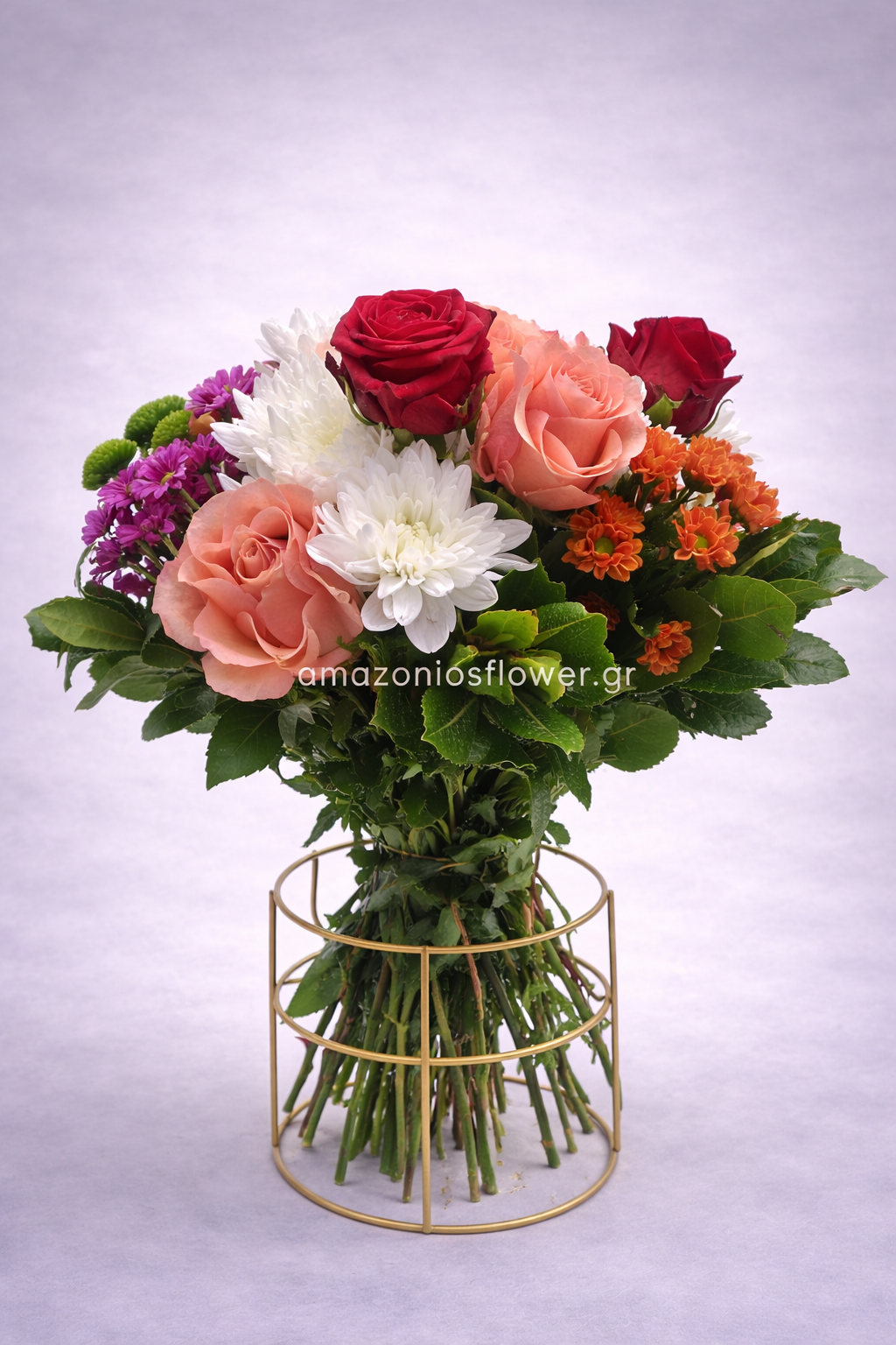 Τα τριαντάφυλλα αποτελούν το κεντρικό στοιχείο της ανθοδέσμης, προσφέροντας ένταση και κομψότητα, ενώ τα χρυσάνθεμα και τα μικρά διακοσμητικά άνθη συμπληρώνουν αρμονικά τη σύνθεση δημιουργώντας πλούσιο όγκο και υφή. Το πλούσιο πράσινο φύλλωμα δίνει ισορροπία και φυσικό χαρακτήρα στο σύνολο.