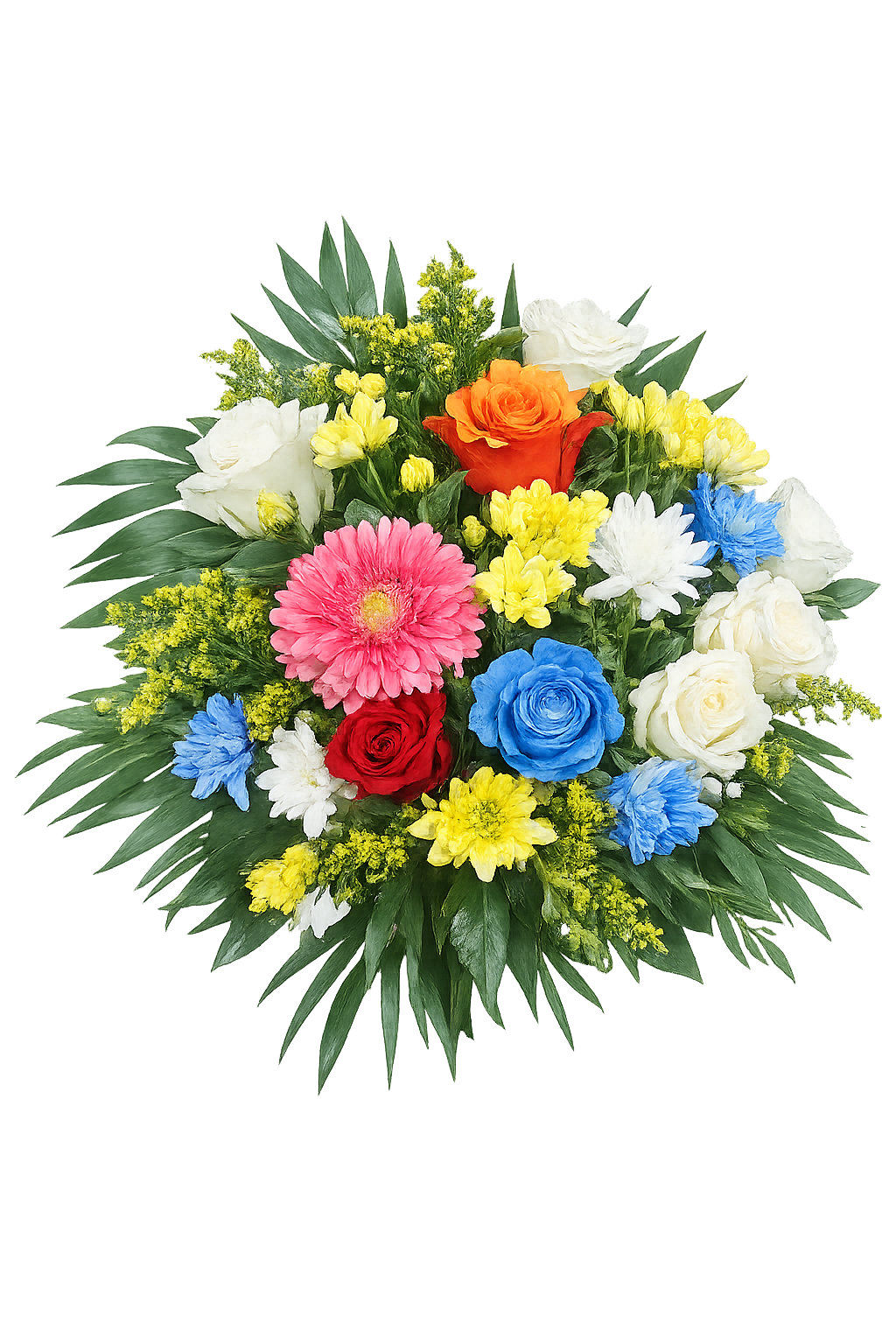 Εντυπωσιακή και ζωηρή ανθοδέσμη σε έντονες αποχρώσεις κόκκινου, κίτρινου, μπλε και λευκού, ιδανική για γενέθλια, ευχές και χαρούμενες περιστάσεις. Η σύνθεση ξεχωρίζει για τον έντονο συνδυασμό χρωμάτων και το πλούσιο φύλλωμα.
