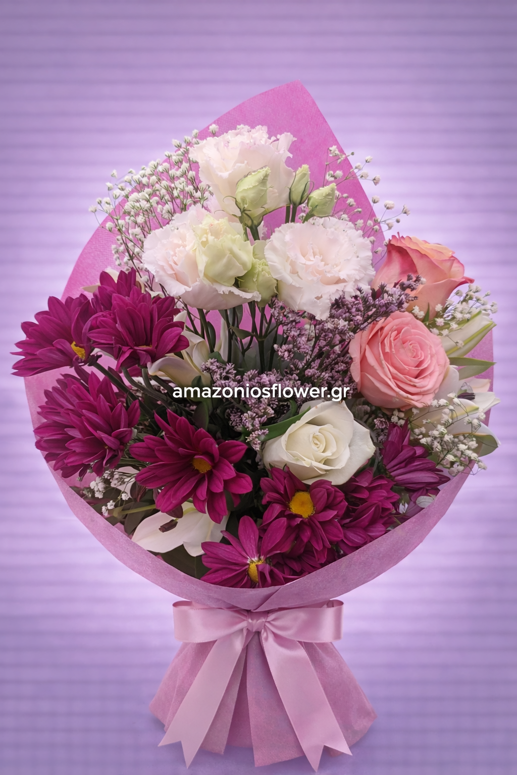 Η ανθοδέσμη εμπλουτίζεται με διακριτικά άνθη gypsophila και φυσικό πράσινο φύλλωμα που δίνουν υφή και φυσικό όγκο στη σύνθεση. Οι απαλές ροζ και μωβ αποχρώσεις συνδυάζονται αρμονικά δημιουργώντας ένα ιδιαίτερα κομψό και ρομαντικό αποτέλεσμα.
