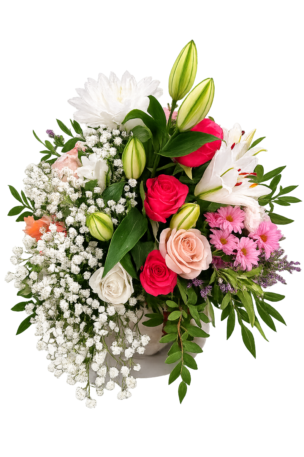 Μια κομψή και εντυπωσιακή ανθοσύνθεση που συνδυάζει λευκά κρίνα, τριαντάφυλλα σε αποχρώσεις του ροζ και του σαμπανί, μαζί με λεπτεπίλεπτα διακοσμητικά άνθη και πλούσιο πράσινο φύλλωμα. Τα κλειστά μπουμπούκια των κρίνων υπόσχονται μια σταδιακή, όμορφη ανθοφορία, ενώ τα τριαντάφυλλα χαρίζουν ρομαντισμό και ζεστασιά στη σύνθεση. Ιδανική επιλογή για ξεχωριστές στιγμές, ευχές, επετείους ή για να διακοσμήσετε έναν χώρο με φρεσκάδα και κομψότητα.