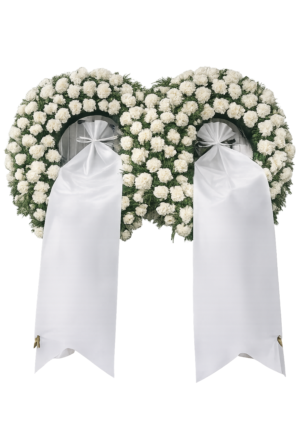 Εντυπωσιακά δίδυμα στρογγυλά στεφάνια πένθους, διαμορφωμένα με πυκνή σύνθεση από λευκά χρυσάνθεμα επάνω σε σταθερή κυκλική βάση πρασίνου. Η λιτότητα του λευκού συμβολίζει σεβασμό, καθαρότητα και αιώνια μνήμη, ενώ η συμμετρική διάταξη προσδίδει επιβλητικότητα και αρμονία. Συνοδεύονται από λευκές κορδέλες με χρυσή γραφή, προσφέροντας έναν διακριτικό και αξιοπρεπή τρόπο αποχαιρετισμού. Κατάλληλα για τελετές κηδείας ή μνημόσυνο, με έμφαση στη σοβαρότητα και την αισθητική συνέπεια