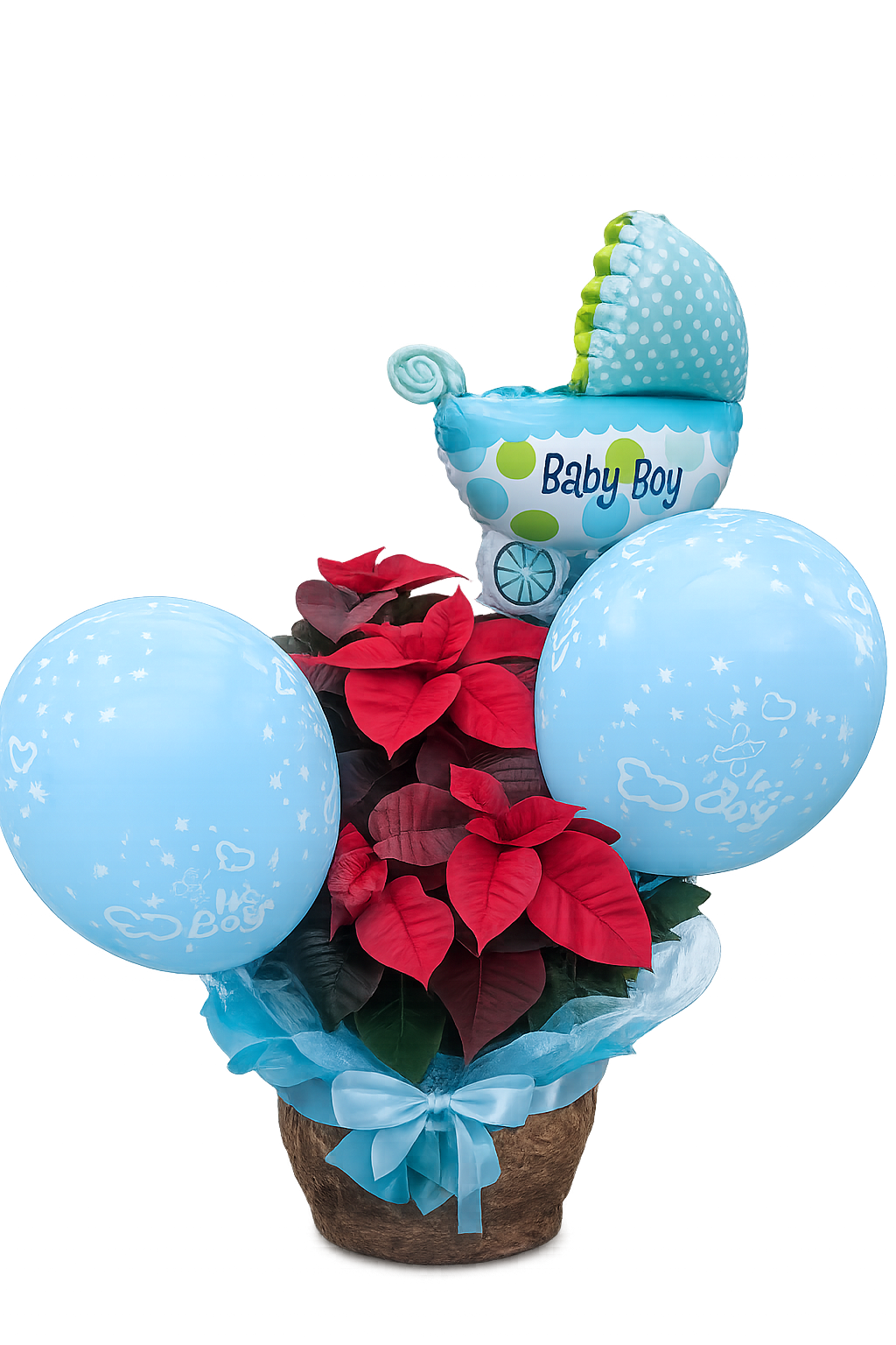Εντυπωσιακή γιορτινή σύνθεση με κατακόκκινη Poinsettia (Αλεξανδρινό) σε διακοσμημένη βάση, συνδυασμένη με μπαλόνια “It’s a Boy” και μεγάλο foil μπαλόνι καροτσάκι “Baby Boy”. Η έντονη αντίθεση του κόκκινου φυτού με τις γαλάζιες αποχρώσεις δημιουργεί ένα δυναμικό και χαρούμενο αποτέλεσμα, ιδανικό για γέννηση αγοριού. Η σύνθεση είναι έτοιμη για παράδοση σε μαιευτήριο ή στο σπίτι, προσφέροντας ταυτόχρονα φυτό με διάρκεια και εορταστικό χαρακτήρα.