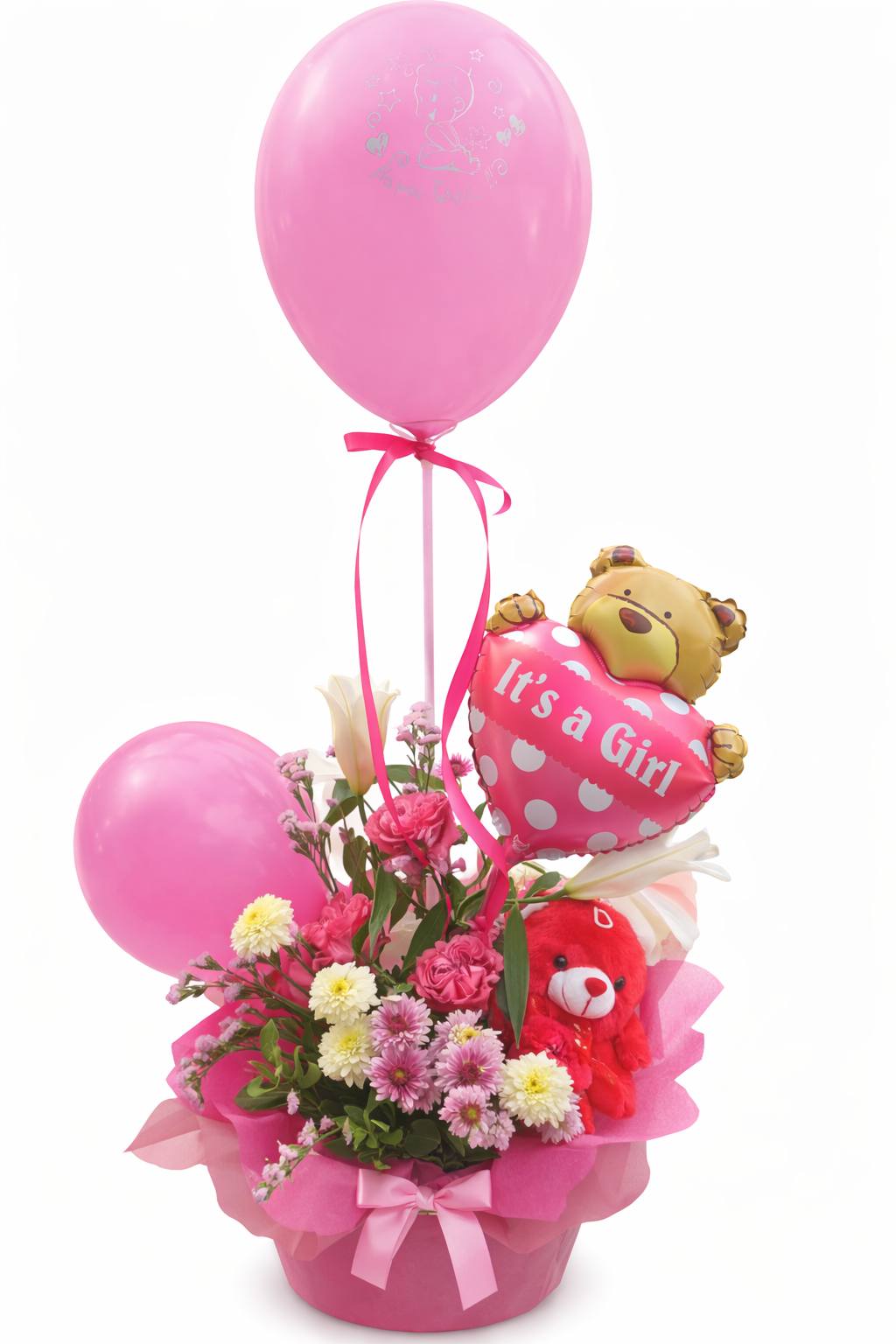 Χαρούμενη και ρομαντική σύνθεση για γέννηση κοριτσιού, σε έντονες ροζ αποχρώσεις. Η σύνθεση περιλαμβάνει φρέσκα λουλούδια (γαρύφαλλα, χρυσάνθεμα και κρίνα), διακοσμημένα σε ροζ βάση με τούλι, συνδυασμένα με μεγάλο ροζ μπαλόνι latex, foil μπαλόνι “It’s a Girl” με αρκουδάκι και μικρό λούτρινο αρκουδάκι στη σύνθεση. Ιδανική επιλογή για μαιευτήριο ή για παράδοση στο σπίτι, με έντονο γιορτινό χαρακτήρα και πλούσια όψη.